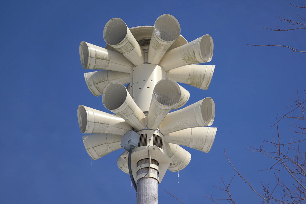 Warnings in Waiting reimagines the sound of the siren in an immersive video installation created with more than twenty collaborators, including Laurie Spiegel and Moor Mother. Filmed across locations from the United States to Lapland and Fukushima, the work traces the lifecycle of sirens, from active warning systems embedded in landscapes of risk to obsolete relics stored in junkyards. Through newly composed soundscapes the installation asks: does an alarm always have to alarm, and how do we respond to constant signals of crisis in a world shaped by war, climate disaster and technological control?